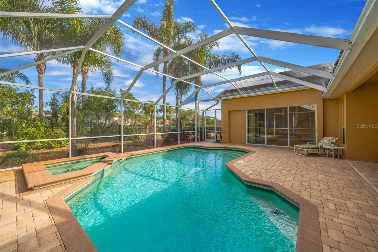 One or more photo(s) has been virtually staged. Come see this beautiful and impeccably maintained custom built Hannah Bartoletta pool home in River Hills! 24-hour manned-gated community. Featuring 4 bedrooms, 3 full baths, 3-car garage, large backyard with golf course views and lush landscaping providing intimate privacy ~ this home is move-in ready! The property sits on a 1/3 of an acre corner lot on the quiet cul-de-sac street of Peach Heather Trail! Upon entering, you are greeted by the formal living and dining rooms adorned with beautiful hardwood floors, high ceilings, oversized windows and fresh paint. Through the living room sliding doors your eye is immediately drawn to the outdoor living space complete with sparkling pool, spa and pavered screen enclosure! Traveling into the spacious kitchen you'll notice the gleaming granite countertops, 42" wood cabinets, closet pantry, breakfast bar and a large center island making food preparation a breeze even for the largest of gatherings! The kitchen flows naturally into the spacious family room with soaring transom windows above the custom built-in entertainment center! The large pocketing sliding doors bring the outside living space in and spill natural light throughout the main living areas ~ perfect for casual entertaining and corporate affairs! The **Triple-Split** floor plan grants privacy for all! Spacious Owner's Retreat features private entry to the outdoor living space, huge walk-in closet, and ensuite bathroom with dual sinks, walk-in shower, and large spa-tub. The secondary bedrooms are oversized with ample closet space, high ceilings, and plush new carpet! The office is adorned with glass french doors and can also serve as a den, playroom, & flex space. The 3 car garage provides for plenty of storage and indoor parking. The oversized pavered driveway provides additional space for parking and activities! The elegant tile roof is equipped with 14 fully owned solar panels ~ helping offset some electrical costs for the home and pool. Water heater just replaced in Jan 2026, new carpet, newer cooktop, newer dishwasher, fresh paint, landscaping & more! River Hills Country Club offers golf & pro-shop packages, tennis, restaurants, bar, gym, pool, playground, basketball court and more! Surrounded by conservation land, you will often feel one with nature when moving throughout the neighborhood. Almost daily, you can see deer grazing across the ponds and on the open spaces. Bald Eagles, Osprey, Great Blue Herons, and Sand Hill Cranes are just a few of the birds you will observe in their natural habitats. Located in a highly rated & desirable school district, this home offers the perfect combination of luxury and convenience. Easy access to major highways. Less than an hour to Florida's beautiful beaches & theme parks. Don't miss the opportunity to make this exceptional property your own. Schedule your private showing today!